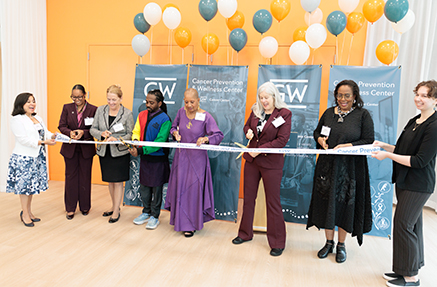 Community leaders, health professionals, and local residents joined members of the George Washington University (GW) School of Medicine and Health Sciences (SMHS) and the GW Cancer Center to celebrate the official ribbon-cutting of the new GW Cancer Prevention and Wellness Center, located on the historic St. Elizabeths campus in Ward 8.