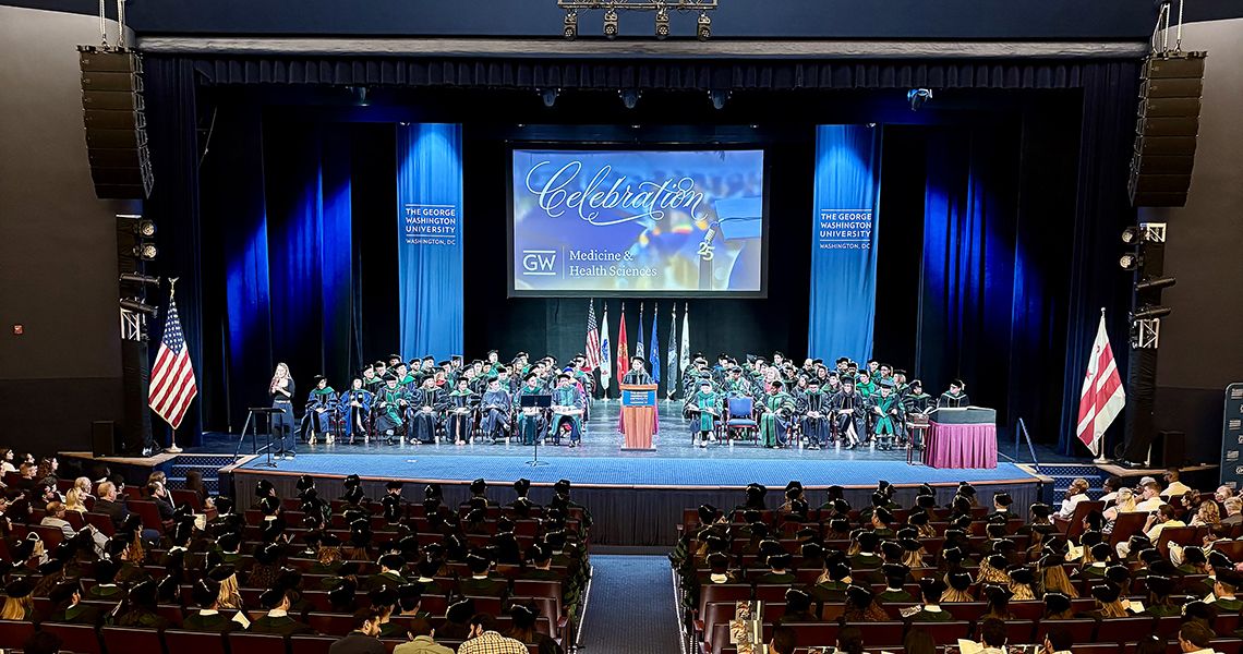 In a moment filled with pride, reflection, and celebration, the George Washington University (GW) School of Medicine and Health Sciences (SMHS) welcomed members of the MD Program Class of 2025 to the medical profession during the annual Graduation and Diploma Ceremony, at Lisner Auditorium on May 18.